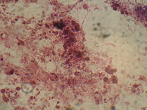 上圖:水痘病毒感染後產生的多核巨細胞(multinucleated giant cell)-以Tzanck smear染色