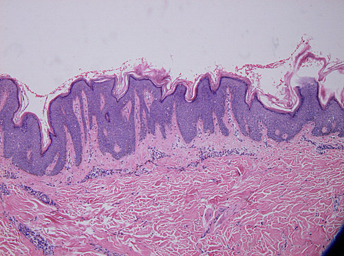 圖:黑色棘皮症 acanthosis nigricans的皮膚病理圖,表皮層的角質細胞與真皮層的纖維母細胞有過度增生的情況。(張家華醫師提供)