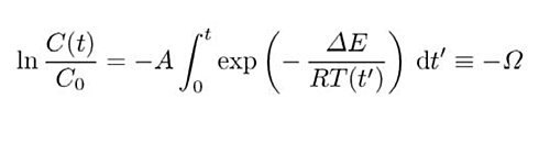 其中C0代表初始的分子或細胞濃度,C(t)表示在時間t的濃度,R代表通用氣體常數(universal gas constant),ΔE 與 Ω 各自代表特定的組織性質,A為Arrhenius常數,其近似值如下: