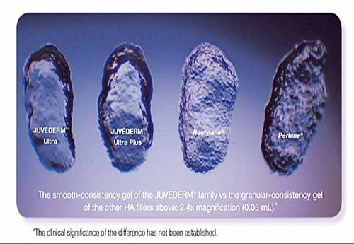 圖:Juvederm與Q-MED玻尿酸(如Restylane與Perlane)的外觀比較,Juvederm玻尿酸較平滑,而Q-MED玻尿酸則較具顆粒狀外表。圖片來源自http://www.juvederm.com